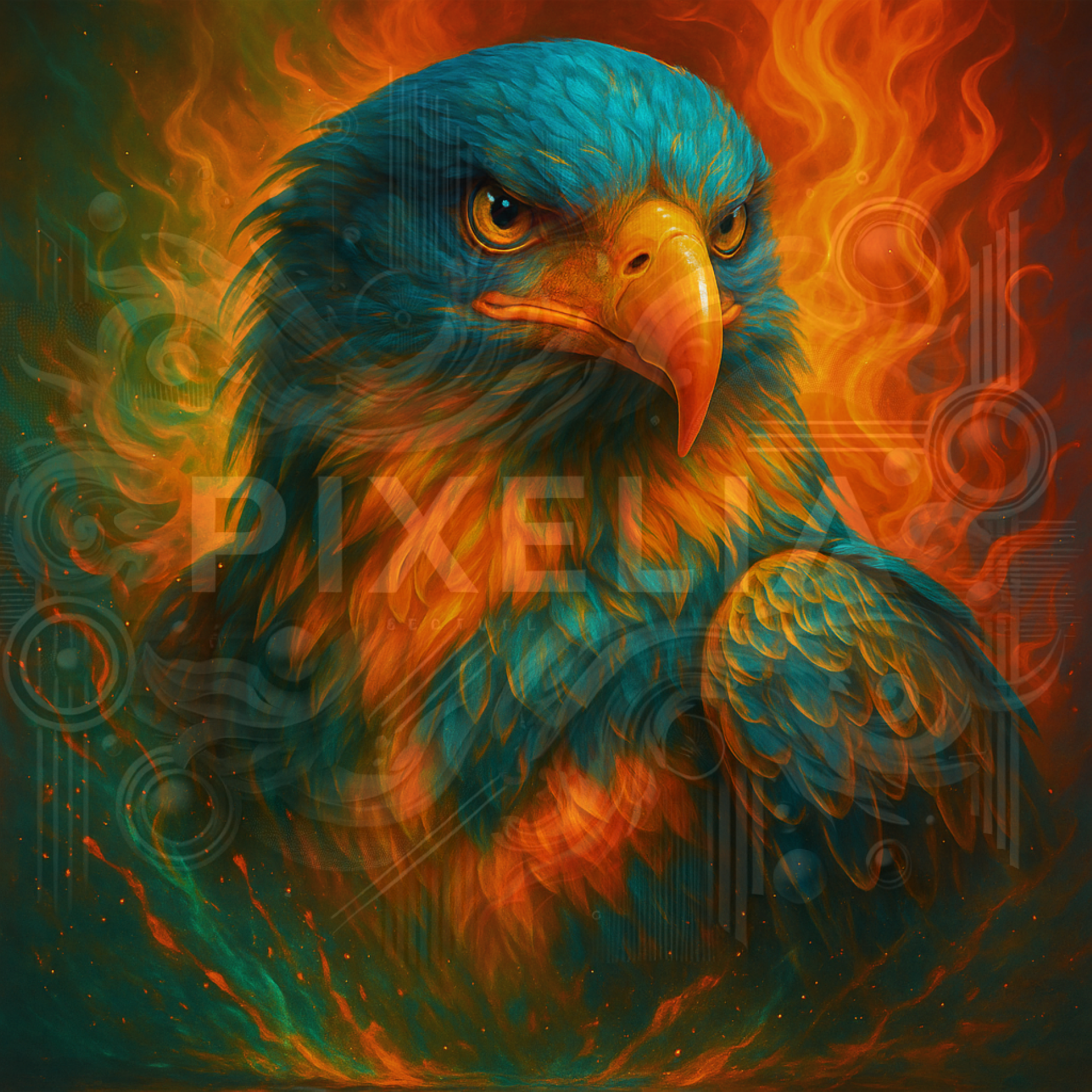 Skyflare ist der flammende Herrscher der Lüfte. Jeder Blick dieses Adlers durchbohrt die Welt – kraftvoll, entschlossen und wachsam. Sein Gefieder gleicht einem Sturm aus glühenden Farben, seine Silhouette flackert zwischen Licht und Rauch. Er ist mehr als ein Tier – er ist ein Zeichen für Weitsicht, Mut und unerschütterliche Stärke im Feuer des Lebens.