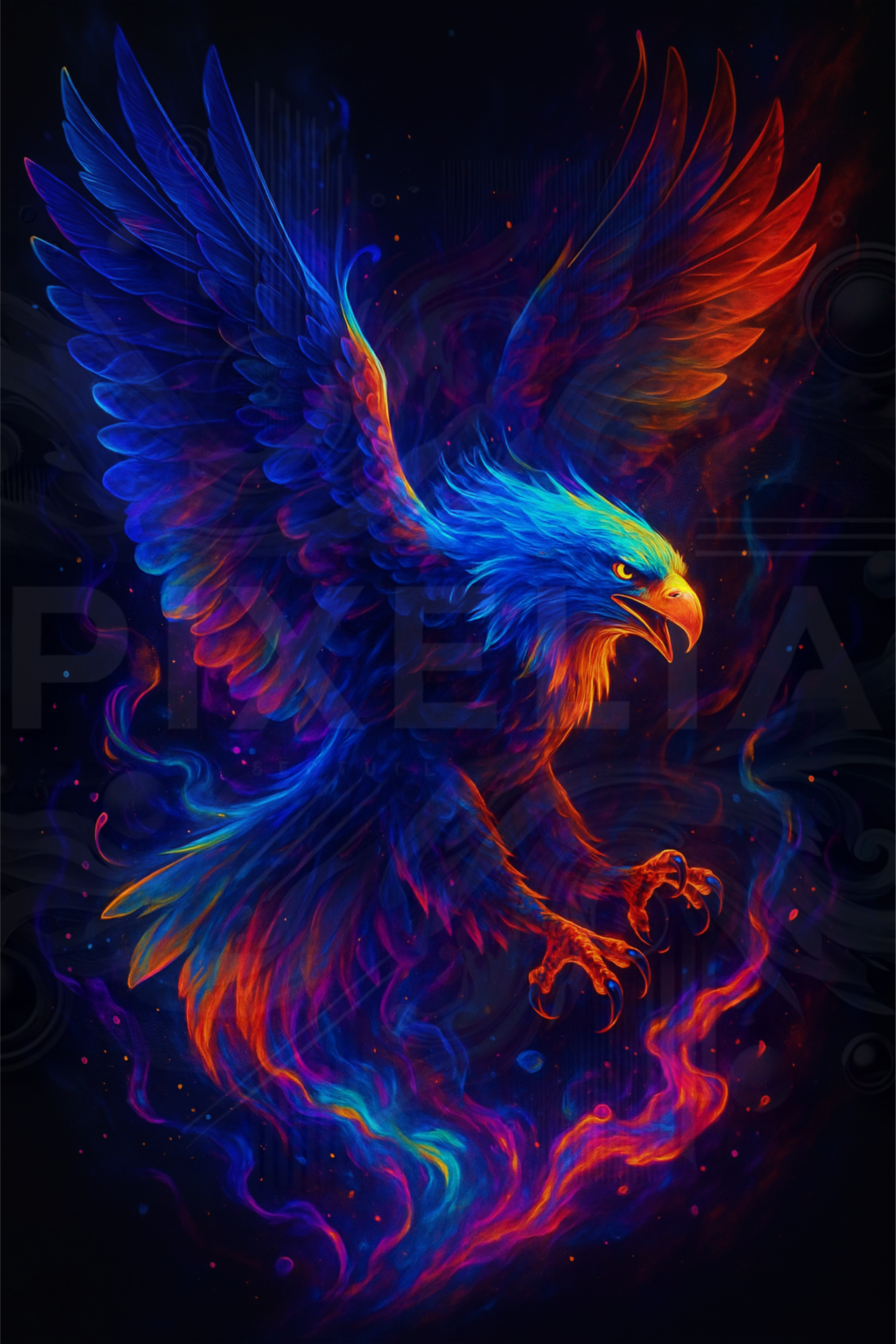 Dieser Adler brennt vor Kraft - Blaze Wing fliegt durch Feuer und Neon, majestätisch und wild. Blau, Rot und Orange verschmelzen zu purer Power. Ein Pixelia-Symbol für Mut und Freiheit.