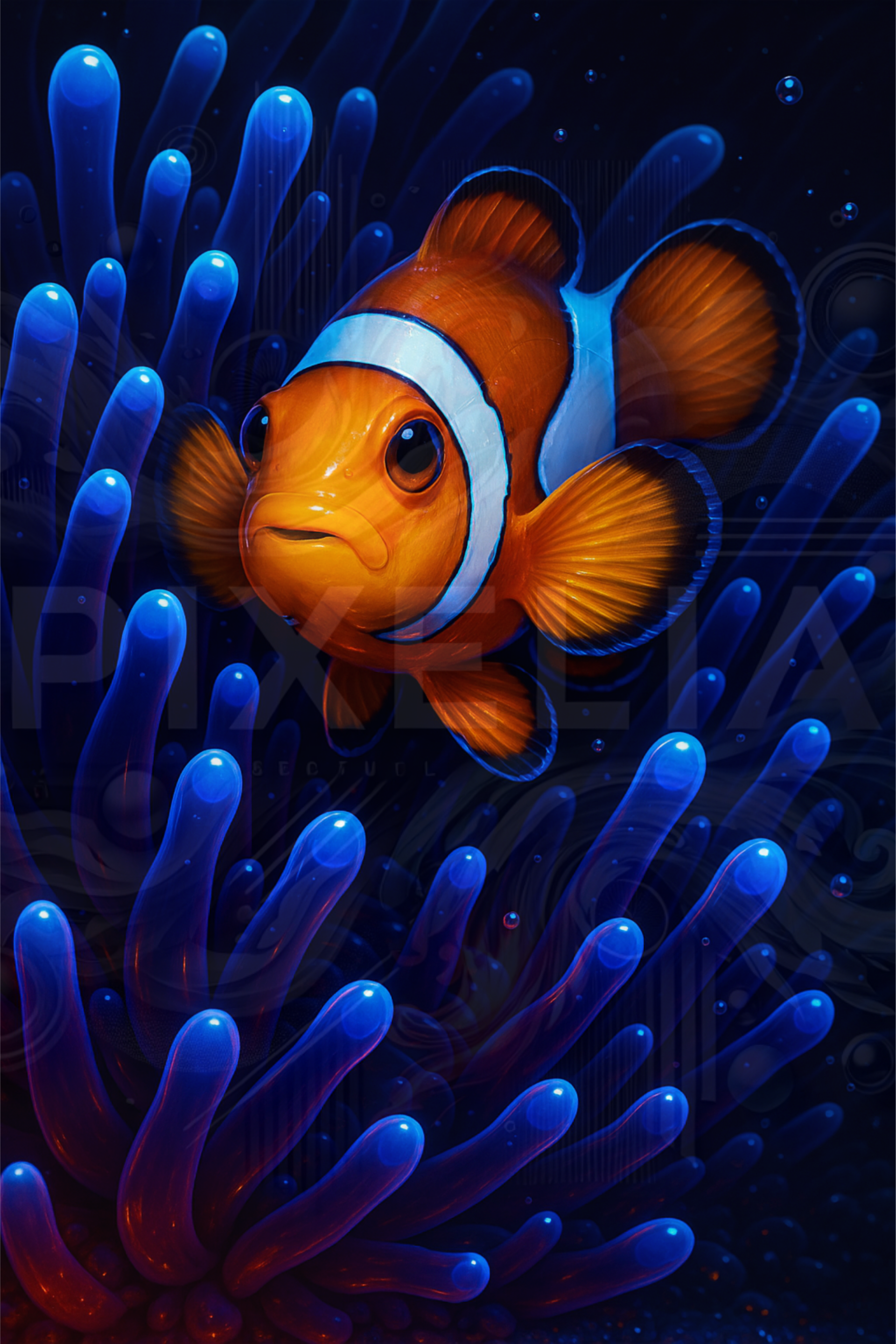 Ein leuchtender Clownfisch versteckt sich neugierig zwischen glänzenden, blauen Anemonen - ein kleines Unterwasserabenteuer für dein Badezimmer oder den Strand. Intensiv, farbenfroh und voller Leben - ein echtes Pixelia-Badetuch mit Wow-Effekt.